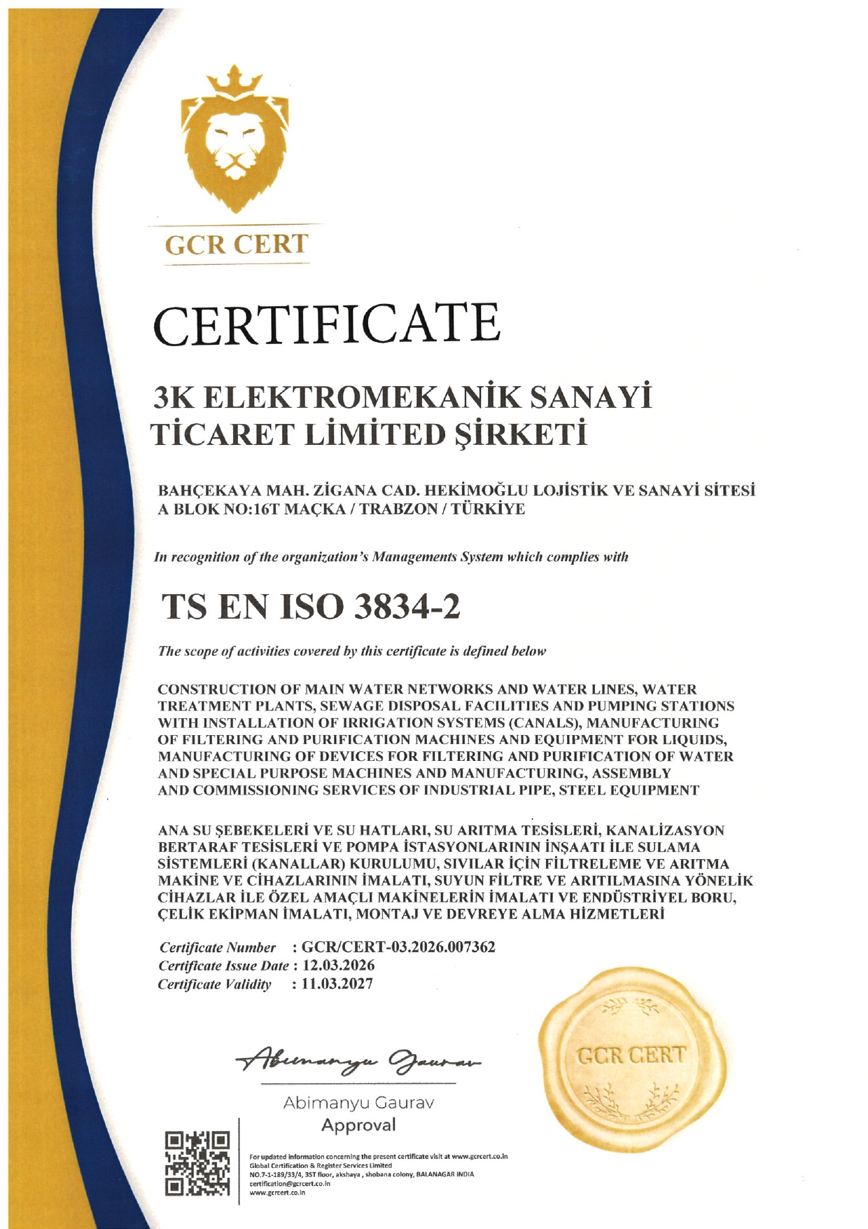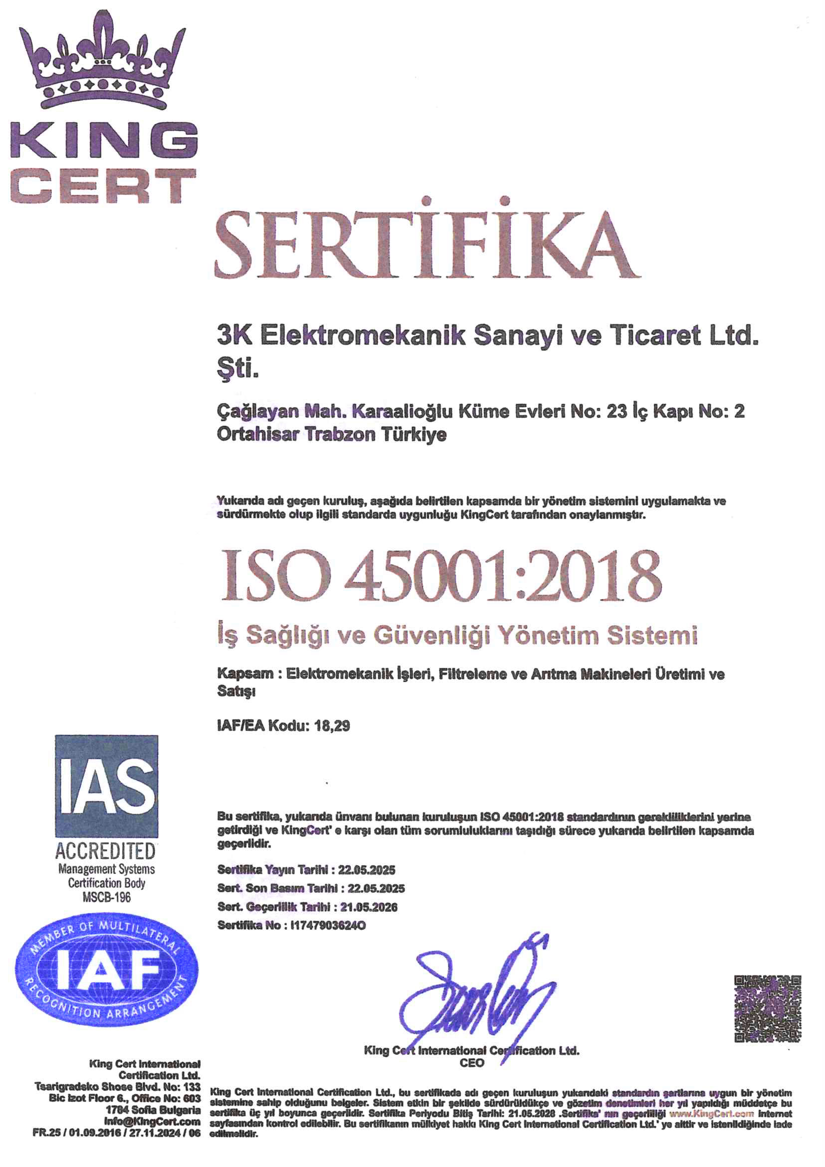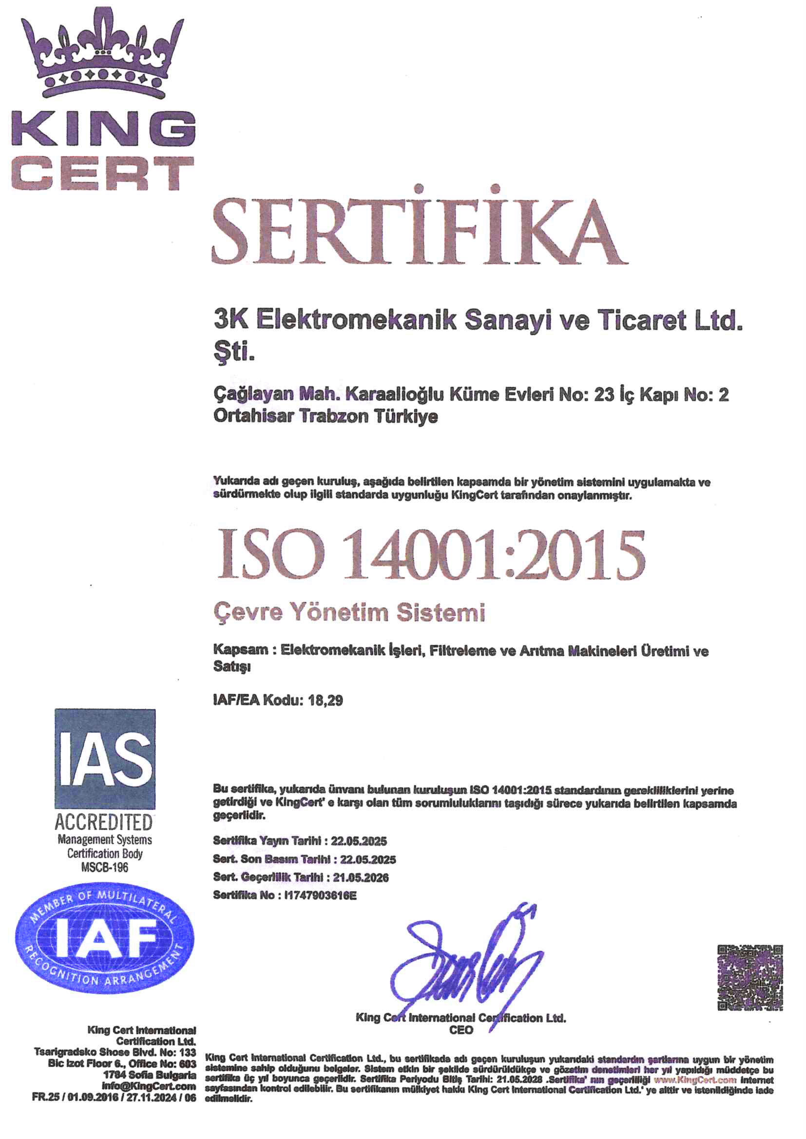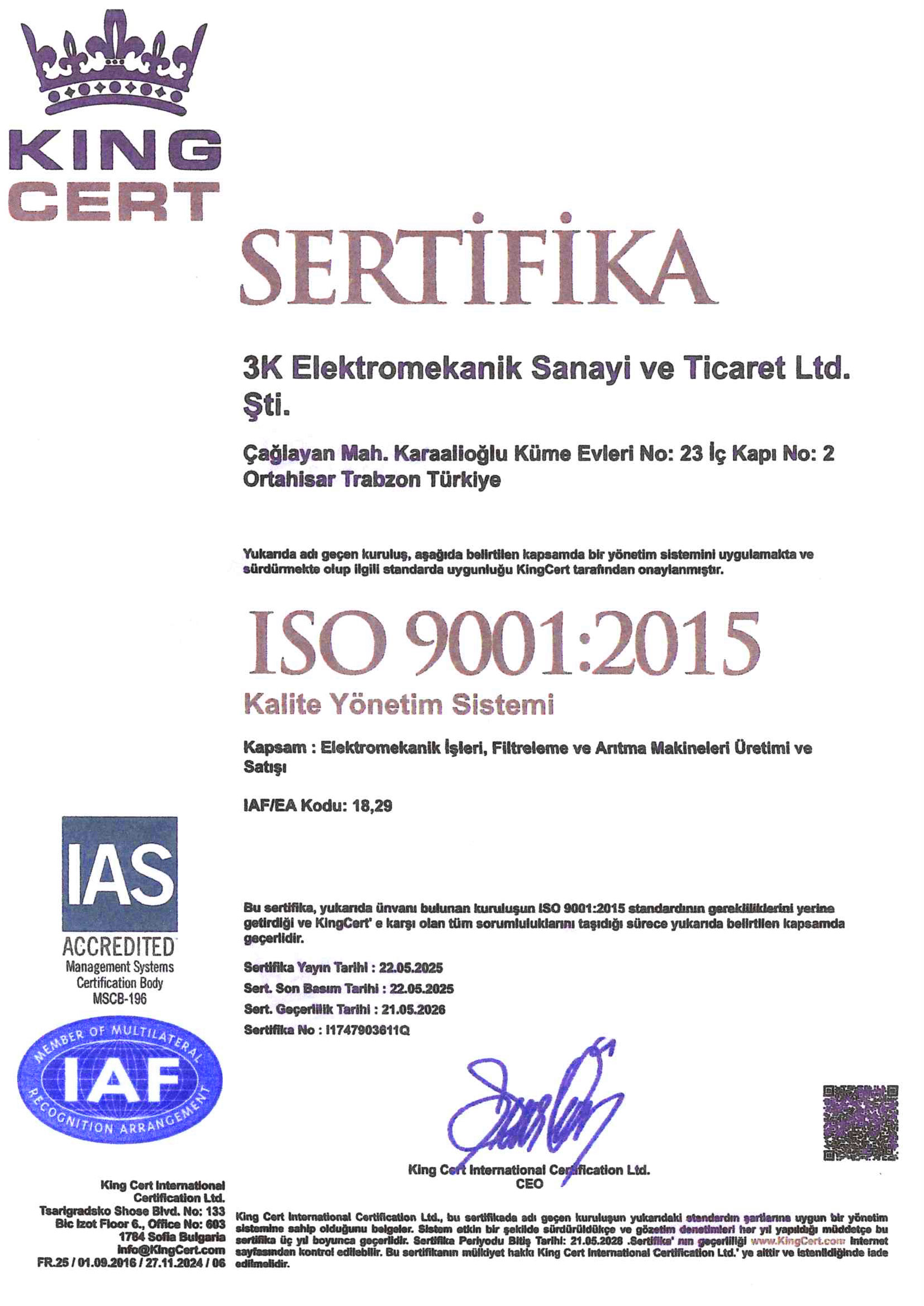 3K Elektromekanik olarak, 2005 yılından bugüne uzanan saha tecrübemizi, uluslararası düzeyde kabul görmüş kalite sertifikalarıyla taçlandırıyoruz. Mühendislik ve imalat çözümlerimizde sürdürülebilirliği, güvenliği ve yüksek standartları esas alarak, tüm süreçlerimizi bağımsız denetleme kuruluşları aracılığıyla tescilliyoruz. Mekanik, elektrik ve otomasyon sistemleri alanındaki uzmanlığımızı belgeleyen sertifikalarımız, müşterilerimize sunduğumuz yenilikçi ve güvenilir çözümlerin bir teminatıdır.